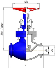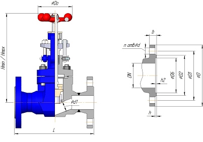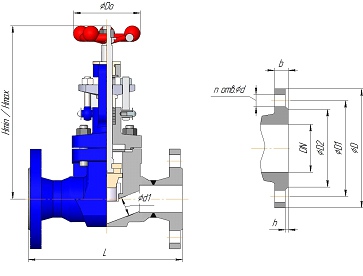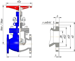 | DN | PN | L | D | D1 | D2 | D6 | n-d | h | h2 | b | H min | H max | D0 | Масса, кг |