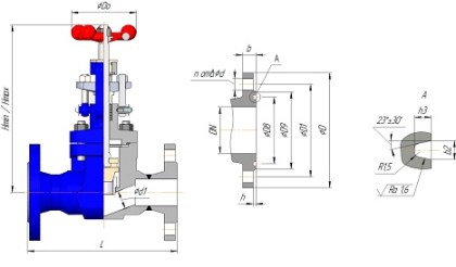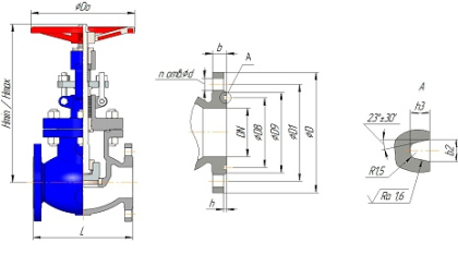 | DN | PN | L | D | D1 | D8 | D9 | n-d | h | h3 | b2 | b | H min | H max | D0 | Масса, кг |