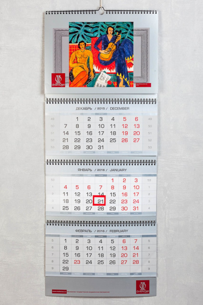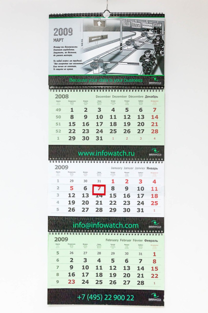 Квартальный календарь с одной картинкой начинает надоедать в течении года. А в красочном перекидном календаре не удобная календарная сетка. Так появился квартальный календарь с перекидными красочными картинками на ригеле. Таких картинок может быть произвольное количество, но обычно это либо четыре по временам года, либо двенадцать по количеству месяцев.