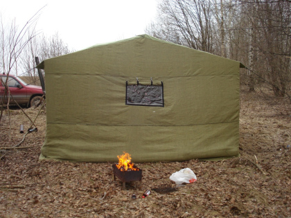 ● на боковой стенке 3 окна с вшитой москитной сеткой, а также прозрачной плёнкой и глухим брезентом на липучках.