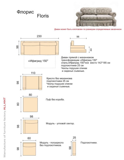 Диван с возможностью комплектации механизмами спального места «Спартак» (раскладушка французского типа). Возможен угловой вариант. Также к модели прилагаются кресла, пуфы. Цена указана в ткани 1 категории. Наполнение подушек спины — синтепух и пенополиуретановые гранулы. Наполнение подушек сидения — пенополиуретан. Каркас — мебельная фанера, деревянный брус хвойных пород. Чехлы на подушки сидения и спины съемные. Возможны различные варианты комплектации. Цена указана в комплектации без механизма трансформации.
